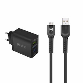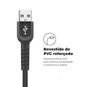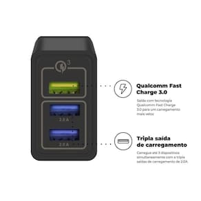 Carregador com 3 saídas USB, sendo uma com Qualcomm 3.0. Cabo resistente com 1,2m e presilha organizadora.Acabamento do material
