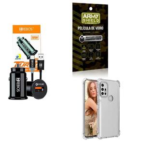 Carregador veicular com carregamento rápido, proteção contra sobrecarga, sobreaquecimento e curto-circuito. Capinha em TPU para absorção de impactos. Película de vidro temperado 3D.Acabamento do material