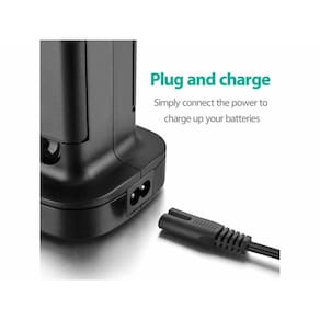Nunca fique sem bateria quando estiver prestes a marcar o ponto vencedor. Economize dinheiro e proteja o meio ambiente usando a bateria recarregável. Conecte suas duas baterias recarregáveis. O indicador luminoso LED mostra o estado de carga das baterias. Carregador de bateria: Entrada: 110~240V AC / Saída: 2.8V DC. O pacote inclui: estação de carregamento de bateria dupla com cabo de alimentação CA; Duas baterias recarregáveis Ni-MH. Compatibilidade: Microsoft Xbox 360 / Xbox 360 Slim
