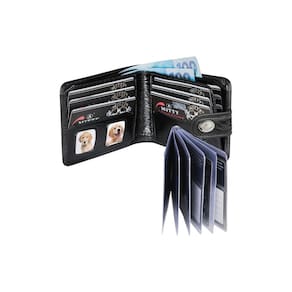 Características: - compartimentos para cartões de crédito; - 4 bolsos com janelas plásticas transparentes; - compartimentos para cédulas.