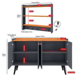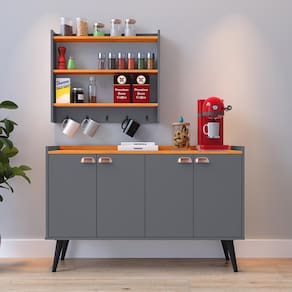 Pensando em deixar seu lar ainda mais aconchegante e organizado, a RPM Móveis elaborou o conjunto Aparador Buffet Kiev com o Armário Suspenso Amélia. O Buffet Kiev conta com 2 prateleiras internas, 4 portas e um amplo tampo, perfeitos para organizar itens de cozinha e montar seu cantinho do café. Já o Armário Amélia conta com 2 prateleiras e 5 ganchos organizadores, ideais para pendurar canecas, xícaras, panos de prato e muito mais. Esse kit é composto por produtos exclusivos e de excelente qualidade que darão ao seu ambiente um toque de elegância e requinte.