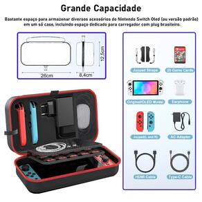 - Compatível com Nintendo Switch OLED - Material resistente: EVA rígido com acabamento em tecido - Interior moldado com compartimentos específicos para o console, carregador com plug tipo brasileiro, Joy-Cons, cabos e jogos - Bolsos internos para pequenos acessórios - Fechamento duplo em zíper e alça para transporte - Design moderno com detalhes em vermelho - Protege contra quedas, riscos e poeira