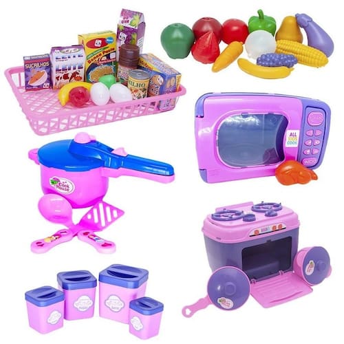 o kit vem com mercadinho, frutinhas e legumes, panelinha de pressão com acessório , microondas com acessório , potinhos de mantimentos e forninho com panelinhas --------------------------------------------------------------------------------------------- - 1 caixinha de suco de uva, - 1 caixinha de leite integral, - 1 caixinha de cereal, - 1 caixinha de macarrão instantâneo, - 1 caixinha de cookies de chocolate, - 2 ovos - 2 pimentões - 1 banana. - 1 lata de milho - 1 lata de achocolatado - material: plástico e papelão - 1 cestinha dimensões aproximadas em cm: 23 de comprimento, 15 de largura