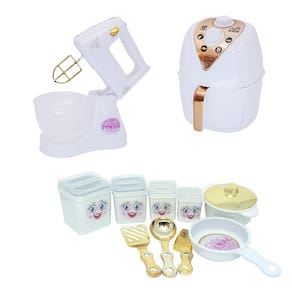 O kit vem com jogo de mantimentos princesa, air fryer, batedeira