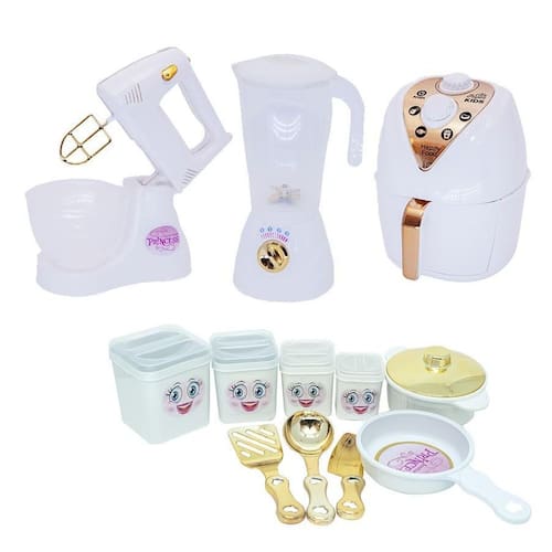 O kit vem com jogo de mantimentos princesa, air fryer, batedeira, liquidificador