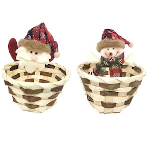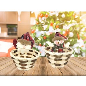 Celebre o Natal com Encanto! Cesto Natalino de Palha Decorado com Boneco Papai Noel e Boneco de Neve de Pelúcia - 12cm