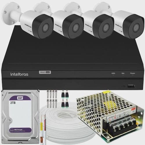 Kit cftv de alta definição intelbras full HD com 4 câmeras acesso via smartphone E computador conteúdo 01 dvr intelbras mhdx 1008 5X1 de 08 canais 04 câmeras intelbras vhd 3230B geração 6 full hd 01 HD western digital purple 2TB interno sata 01 fonte eletrônica chaveada 12V 05A bivolt 100 metros de cabo coaxial flexível 4MM 80% de malha 08 conectores bnc antirruído parafuso E mola 04 conectores P4 macho com borne 01 mouse usb
