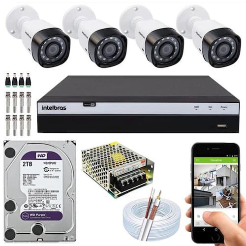 CONTEÚDO01 Dvr Intelbras Mhdx 3004 Multi Hd De 04 Canais Com Hd Interno De 2TB Wd Purple04 câmeras Intelbras Vhd 1220B geração 4 Full Hd01 Fonte eletrônica Chaveada 12V 05A Bivolt01 Caixa Com 55 Metros De Cabo Coaxial flexível 4MM 85% De Malha08 Conectores Bnc antirruído Parafuso E Mola04 Conectores P4 Macho Borne01 Mouse Usb