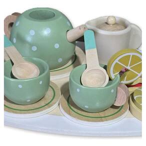 O Kit Chá/Cozinha em madeira inclui: - 1 Travessa tábua - 3 Bases - 2 Xícaras - 2 Colheres - 1 Limão - 1 Jarra com tampa - 1 Chaleira com tampa - 2 Biscoitos - 1 Chá em sachê