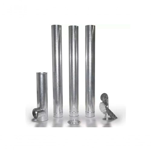 Kit para montagem de chaminé com encaixe super facilitado, confeccionado em chapa galvanizada com 6 (seis) peças. Ideal para vários tipos de fogões a lenha. Contém 3 canos de 1,00m x 110mm, 1 joelho de 0,50m com tampa saída atrás, 1 chapéu chinês (não giratório) e 1 anel com saída em cima.Tipo
