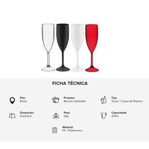 FICHA TÉCNICA TAÇAS: -- País: Brasil Produtor: Boccati Utilidades Tipo: Taças / Copos de Plástico Dimensões: 6x22,5cm Peso: 62g Capacidade: 210ml Material: PS - Poliestireno Cores: Branco, Incolor, Vermelho Translúcido e Preto