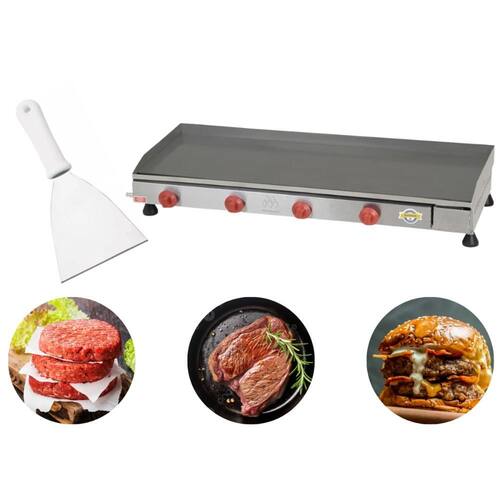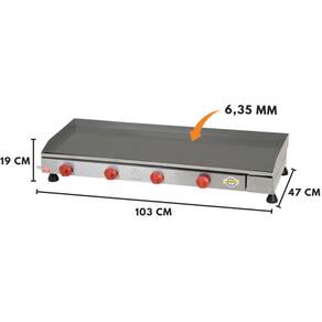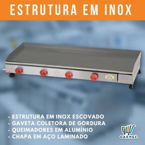 Acompanha Espátula em Inox Possui estrutura em aço inoxidável escovado; Queimadores em alumínio tubular; Pés em borracha, niveladores anti-derrapantes; Chapa de fritura em Aço 1020 com aproximadamente 6,35 MM de espessura; Injetores reguláveis; Prensa em aço inox opcional; Ideal para o preparo de lanches; Temperatura máxima aproximada: 295° C Indicado para Lanchonetes, Bares, Padarias, Restaurantes, Hotéis e Pousadas e Serviços de Alimentação em geral.