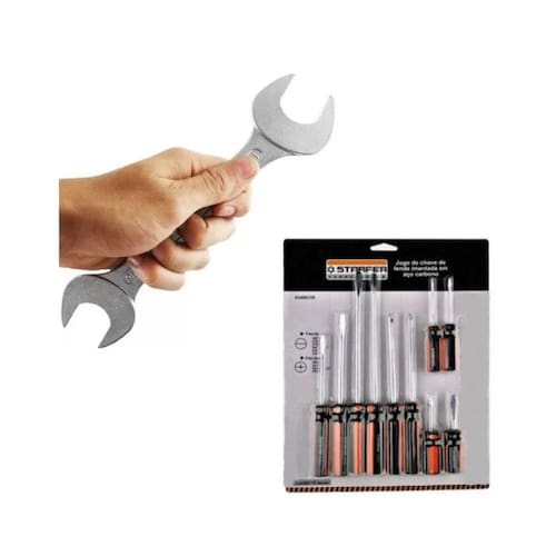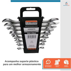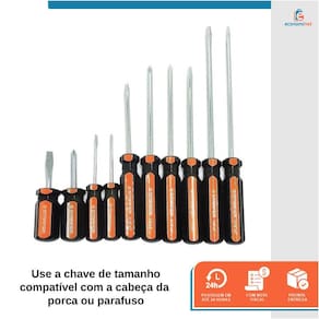 A Chave fixa é ideal para aperto e desaperto de parafusos ou porcas com perfil quadrado ou sextavado. Fabricado em aço carbono oferece durabilidade e resistência, para funcionamento adequado é necessário usar a chave de tamanho compatível com a cabeça da porca ou parafuso.Características técnicas:Material: Aço carbono níquel-cromadoMedidas: 6 a 22mmQuantidade: 8 peças + suporte plásticoTipo de chave: FixaMarca: StarferRef.: 3502279Conteúdo da Embalagem:• 01 Suporte plástico• 01 Chave fixa de 6x7mm | 8x9mm | 10x11mm | 12x13mm | 14x15mm | 16x17mm | 18x19mm | 20x22mmAs chaves de Fenda e Phillips são ferramentas essenciais para ter em sua casa ou na sua caixa de ferramentas. Indicadas para aperto e desaperto de parafusos do tipo fenda e phillips. Fabricadas em aço carbono com cabo em pvc para melhor conforto e estabilidade nos trabalhos, magnetizada na ponta de cada ferramenta para facilitar o aperto em lugares apertados sem que você perca o parafuso e facilita na hora de retirar o parafuso depois de solto. Podem ser utilizadas para auxiliar com computadores, vídeo-games, geladeiras e eletrônicos em geral que possuam parafusos do tipo fenda ou phillips. CARACTERÍSTICAS TÉCNICAS:Material: Aço CarbonoMaterial do cabo: PVCTipo de chave: Fenda e PhillipsQuantidade do jogo: 10 peçasMarca: StarferRef.: 34802166 CHAVES DE FENDA:• 1/8" x 2" – 3,0mm (fenda) x 110mm (comprimento total) x 55mm (comprimento cabo)• 3/16" x 3" – 4,7mm (fenda) x 155mm (comprimento total) x 80mm (comprimento cabo)• 3/16" x 6" – 4,7mm (fenda) x 230mm (comprimento total) x 80mm (comprimento cabo)• 1/4" x 6" – 6,3mm (fenda) x 230mm (comprimento total) x 80mm (comprimento cabo)• 1/4" x 4" – 6,3mm (fenda) x 180mm (comprimento total) x 80mm (comprimento cabo)• 1/4" x 1.1/2" – 6,3mm (fenda) x 90mm (comprimento total) x 50mm (comprimento cabo) 4 CHAVES DE PHILLIPS:• PH0: 1/8" x 2": 3,0mm (fenda) x 110mm (comprimento total) x 55mm (comprimento cabo)• PH1: 3/16" x 4": 4,7mm (fenda) x 180mm (comprimento total) x 80mm (comprimento cabo)• PH2: 1/4" x 4" – 6,3mm (fenda) x 180mm (comprimento total) x 80mm (comprimento cabo)• PH2: 1/4" x 1.1/2" – 6,3mm (fenda) x 90mm (comprimento total) x 50mm (comprimento cabo)
