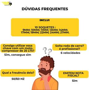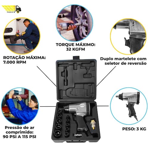 Kit chave de impacto pneumática 1/2 32kgf 17 peças Truck ponto com Nossa equipe de atendimento está sempre pronta para te atender da melhor forma possivel. Emitimos para empresas e pessoa fisica - produto com de fabrica contra defeitos de fabricaçao Kit chave de impacto pneumática 1/2 32kgf 17 peças rotta 376 é uma ferramenta utilizada para apertar e soltar porcas de segurança. Este tipo de ferramenta foi desenvolvido especialmente para proporcionar a máxima transmissão da energia de impacto para a porca sendo muito útil para a manipulação de parafusos oxidados, entre outras utilizações. Aplicação: serviço de manutenção geral para todos os tipos de indústrias, oficinas e concessionárias. Rotação máxima de 7.000 rpm reversivél 4 velocidades de torque 1,2,3 e 4 Sistema de reversão com pino Kit completo com chave allen, extensão, 10 soquetes, mini lubrifil, bisnaga de óleo, engate rápido e maleta. Dados técnicos: Modelo: 700532 Mecanismo twin hammer 10 soquetes : 9mm; 10mm; 11mm; 13mm; 14mm; 17mm; 19mm; 22mm; 24mm; 27mm. Rotação máxima: 7.000 rpm Pressão de ar comprimido: 90 psi a 115 psi Consumo médio de ar: 5 pcm Torque máximo: 32 kgfm Entrada de ar: 1/4 Mangueira de ar indicada: 1/4''' Encaixe soquete 1/2' Sistema de exaustão: frontal Peso: 3 kg Estrutura duplo martelete seletor de reversao Perguntas frequentes feitas por nossos clientes... Clientequal o máximo de ar posso usar nela R:bom dia, tudo bem 9pci. Atenciosamente Clientebom dia ela funciona normal em um compressor de ar de 8,7 pés e 24 litros R:bom dia, tudo bem Sim funcionará para que essa Ferramenta de aplicação funcione, o compressor terá que ter no minimo 90psi . Atenciosamente Clienteboa noite solta rada de carro é profissional R:bom dia, tudo bem Utilizada para apertar e soltar porcas de segurança para todos os tipos de indústrias, oficinas e concessionárias. Atenciosamente, Clientebom dia amigo. Consigo utilizar esta chave com um moto-compressor de 25 lts Somente para uso em casa, não profissional R: boa tarde consegue utilizar. Atenciosamente Emitimos nfe cnpj e cpf Contamos com um mix de peças e ferramentas em nosso catalogo. No nosso anuncio logo abaixo das imagens tem a opçao 'mais anúncios deste vendedor' por la encontra varios produto oferecidos por nossa loja com certeza podera estar fazendo ótimos negócios. Marca: Não Informado
