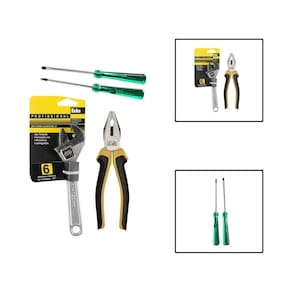 Conteúdo da embalagem: - 01 chave inglesa boca ajustável 6. - 01 alicate universal 8 de aço carbono com cabo emborrachado. - 01 chave de fenda 3/16 x 4 imantada. - 01 chave philips 3/16 x 4 imantada.