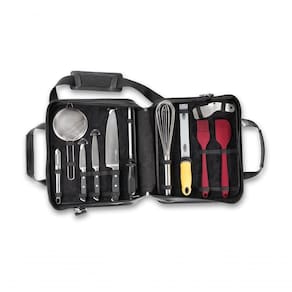 Composição - 01 Espátula01 Pincel de silicone01 Batedor Profissional em aço inox01 Ralador Zester01 Faca Chef Infinity 801 Faca para Cozinha Infinity 501 Faca para Legumes Inifnity 3 , 01 Peneira em aço inox01 Descascador de Legumes01 Abridor de Latas Profissional01 Chaira 8 01 Pasta 38,3 x 32,3 x 10 cm*foto ilustrativa - a Espátula e Pincel de Silicone na COR VERMELHA
