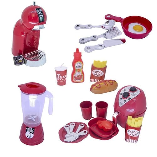 o kit vem com jogo de jantar com air fryer, cafeteira com cápsula, liquidificador, panelinha com acessório sórtido, comidinhas