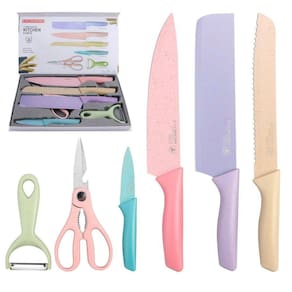 Conteúdo da Embalagem: - 1 Faca Chef 8 cm ; - 1 Faca Pão 8 cm ; - 1 Faca para descascar 3,5 cm ; - 1 Cutelo Pequeno 8 cm ; - 1 Descascador de cerâmica; - 1 Tesoura.