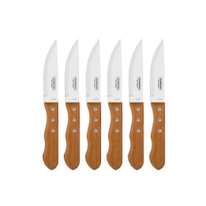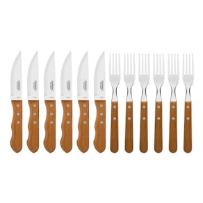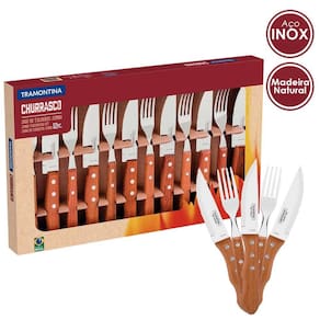 Kit Churrasco 12 Peças Jumbo Garfo Faca Tramontina 2239906CARACTERÍSTICAS:- Com o Jogo de Talheres Jumbo para Churrasco Tramontina com Lâminas em Aço Inox e Cabos em Madeira Natural 12 Peças, você terá os itens perfeitos para saborear aquele churrasco em família! - Eles combinam com qualquer ambiente e ainda deixam a hora da refeição mais bonita e charmosa, pois os cabos são produzidos em madeira natural com acabamento polido. - As lâminas são em aço inox e contam com um fio de alta durabilidade devido ao tratamento térmico a que foram submetidas. - As lâminas das facas têm maior durabilidade do fio devido ao tratamento térmico.- As lâminas dos garfos conta com maior espessura e uma estampagem do aço que garante maior resistência, evitando deformações.ESPECIFICAÇÕES:- Marca:Tramontina- Modelo:2239906- Lâminas de aço inox.- Peso: 0,77 kg- Os cabos são de madeira natural.- Comprimento Grafo: 215 mm- Largura Grafo: 26 mm- Altura Grafo: 23 mm- Comprimento Faca: 250 mm- Largura Faca: 31 mm- Altura Faca: 18 mmCONTÉM NA EMBALAGEM:- Conjunto com 12 peças