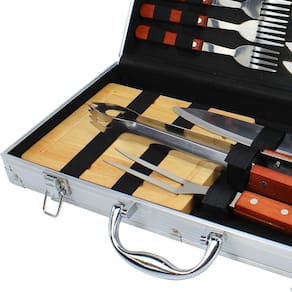 Kit churrasco 17 peças gourmet garfo e faca madeira e maleta Kit churrasco 17 peças em aço inox com cabo de madeira e maleta em alumínio. Faça um churrasco espetacular com nosso kit para churrasqueiro, prepare seu churrasco com muito mais praticidade, estilo e profissionalismo com esse kit para churrasco com 17 peças em aço inox. Nosso kit acompanha uma maleta em alumínio com forro interno em tecido para o armazenamento ideal e cuidadoso das suas peças.