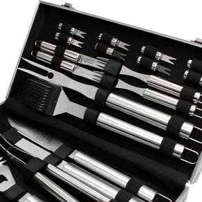 Kit churrasco 19 peças em aço inox com maleta em alumínio. Faça um churrasco espetacular com nosso kit para churrasqueiro, prepare seu churrasco com muito mais praticidade, estilo e profissionalismo com esse kit para churrasco com 19 peças em aço inox. Nosso kit acompanha uma maleta em alumínio com forro interno em tecido para o armazenamento ideal e cuidadoso das suas peças.