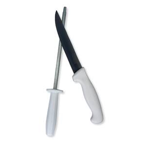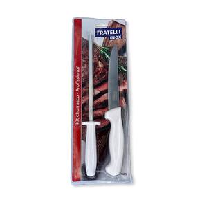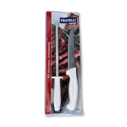 - Kit De Churrasco 2 Peças Faca e Chaira Contém: - Faca: 30 cm - Chaira: 31 cm Material: Aço Inox e Plástico