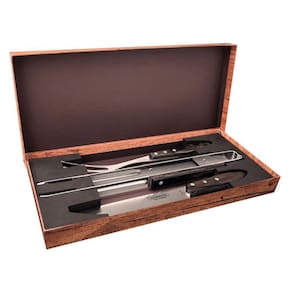 O jogo trinchante Tramontina com lâminas em aço inox e cabos de madeira tratada Polywood castanho 03 peças vai transformar a hora de preparar e servir seu churrasco. Desenvolvidas com lâminas em aço inox e cabos de madeira tratada Polywood com rebites de aço inox, as peças garantem maior durabilidade e resistência, e a faca, um excelente poder de corte, devido ao tratamento térmico. Ele ainda pode ser levado à máquina de lavar louças e vai facilitar a hora de guardar, pois as peças vem em uma linda caixa de papelão litografado!
