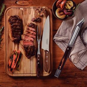 - Marca: Tramontina; - Pegador / Cabo: Madeira Tratada Polywood; - Cor: Aço Inox e Castanho; - Material: Aço Inox e Madeira; - Referência: 29899265; - Tratamento do Talher: Tratamento Térmico; - Garantia: 5 anos junto ao fabricante.