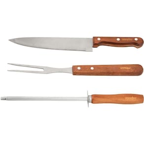 1 Jogo de utensílios para churrasco com 4 peças, sendo: 1 faca, 1 garfo, 1 chaira e 1 maleta.
