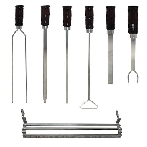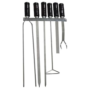 Kit Churrasco 7 Peças Espetos Garfo Batedor Suporte Mexedor DESCRIÇÃO DO PRODUTO Kit Churrasco 7 Peças Espetos Garfo Batedor Suporte Mexedor. Kit: o nosso kit para churrasco é excepcional de todas as maneiras possíveis, pois contém 7 peças/acessórios excelentes para lhe agregar uma ótima performance durante o seu churrasco. O nosso kit contém 3 espetos para te auxiliar, sendo: 1 Espeto Duplo ideal para cortes maiores e melhor firmeza para carnes mais largas e pesadas ; 1 Espeto Simples ideal para cortes que não precisam de muita sustentação, carnes mais flácidas ; 1 Espeto Miúdo ideal para cortes menores, como , coração, queijo e aperitivos . Também contém 1 Garfo; 1 Batedor de Sal para tirar o excesso de sal da carne após terminar de assa-lá ; 1 Suporte para pendurar seus acessórios de churrasco ; 1 Mexedor de Brasa para manusear e misturar a brasa mantendo a carne aquecida de maneira correta durante o assado . Sobre o Produto: Material dos Cabos: Madeira Material das Lâminas, Hastes e Pontas: Alumínio Peso Total: 1.36 Kg Acessórios e Medidas: Espeto Duplo 60cm: Diâmetro do Cabo --- 3,5cm Comprimento do Cabo --- 15cm Comprimento das Pontas --- 60cm Distância das Pontas --- 6cm Comprimento Total --- 75cm Peso: 0.20 Kg Espeto simples 60cm: Diâmetro do Cabo --- 3,5cm Comprimento do Cabo --- 15cm Comprimento da Lâmina --- 60cm Largura da Lâmina --- 1,6cm Espessura da Lâmina --- 5mm Comprimento Total --- 75cm Peso: 0.23 Kg Espeto Miúdo 60cm: Diâmetro do Cabo --- 3,5cm Comprimento do Cabo --- 15cm Comprimento da Lâmina --- 60cm Largura da Lâmina --- 1cm Espessura da Lâmina --- 3mm Comprimento Total --- 75cm Peso: 0.16 Kg Mexedor de Brasa: Diâmetro do Cabo --- 3,5cm Comprimento do Cabo --- 15cm Comprimento da Haste --- 45,5cm Comprimento da Ponta-Triângulo --- 6,5cm Largura da Ponta-Triângulo --- 9cm Comprimento Total --- 65,5cm Peso: 0.27 Kg Batedor de Sal: Diâmetro do Cabo --- 3,5cm Comprimento do Cabo --- 15cm Comprimento da Lâmina --- 31,5cm Espessura da Lâmina --- 5mm Comprimento Total --- 46cm Peso: 0.20 Kg Garfo: Diâmetro do Cabo --- 3,5cm Comprimento do Cabo --- 15cm Comprimento da Ponta --- 28cm Comprimento Total --- 43cm Peso: 0.15 Kg Suporte: Largura --- 28cm Espaçamento para Acessórios --- 1cm Peso: 0.14 Kg