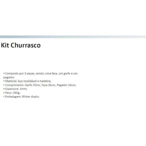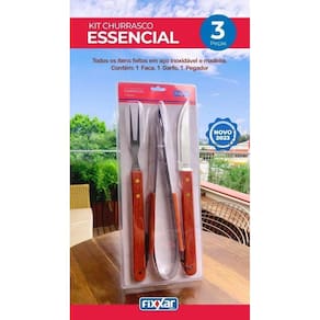 Kit para churrasco Fixxar Essencial, composto por 03 peças de cabo de madeira e aço inoxidável que garante melhor corte e maior durabilidade do produto.Itens inclusos:- 1 Faca 36 cm- 1 Garfo 35 cm- 1 Pegador / Pinça 34 cm- Espessura: 1mmDiferenciais:- Kit completo com 03 peças;- Tudo que você precisa para preparar aquele delicioso churrasco está nesse kit;- Peças produzidas em aço inoxidável com cabo de madeira que garante maior durabilidade para o produto;- Design moderno e inovador;- Ótima opção de presente para aniversário, dia dos pais, dia dos namorados, presente para sogro, presente para filho e demais churrasqueiros;Medidas aproximadas da embalagem:41 x 17 x 5 cmPeso aproximado da embalagem:380 gramasEmbalagem:Blister duplo