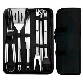 Itens Inclusos: Kit Churrasco 10 peças com bolsa de nylon 1 Bolsa de Nylon preta: 38 cm X 11,8 cm 1 Faca: 32,4 cm X 2,6 cm 1 Espátula: 34 cm X 7 cm 1 Pegador: 33,6 cm X 4,3 cm 1 Garfo: 33,7 cm X 3,3 cm 1 Pincel: 34,5 cm X 4,7 cm 1 Espetos: 36 cm X 2,5 cm Marca: Não Informado