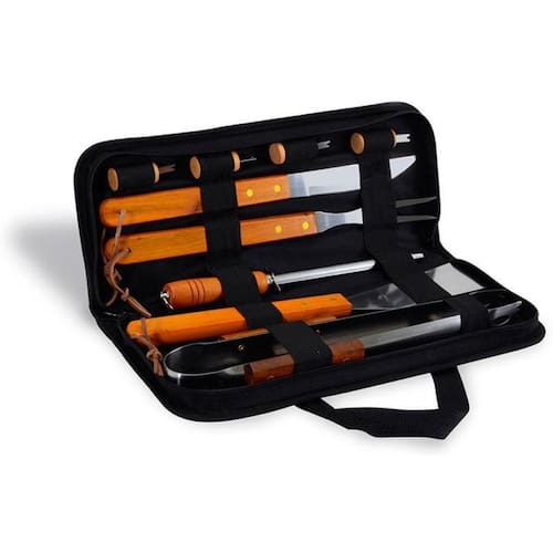 O kit conta com 4 espetinhos modelo fisga, 1 faca, 1 garfo, 1 espátula, 1 amolador chaira, 1 pinça e 1 maleta de Nylon.