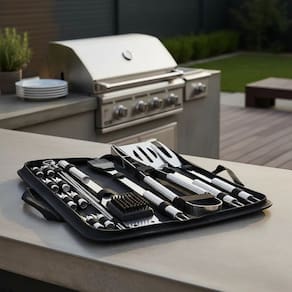 INTERESSE O Jogo de utensílios para churrasco em aço inox de 20 peças oferece a solução técnica para quem busca precisão na frente da grelha. Fabricado integralmente em metal resistente, este conjunto elimina o uso de componentes que oxidam ou retêm odores, garantindo uma manipulação segura e eficiente dos alimentos.