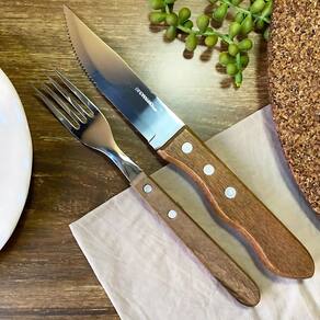 Os talheres Jumbo possuem lâminas em aço inox de alta resistência, perfeitas para cortes precisos e eficientes de carnes. Os cabos anatômicos em madeira Guajuvira tratada garantem segurança, conforto no manuseio e um visual rústico que combina com qualquer ocasião, seja um churrasco em família ou um encontro entre amigos. Os cabos de madeira com rebites proporcionam maior firmeza e durabilidade.