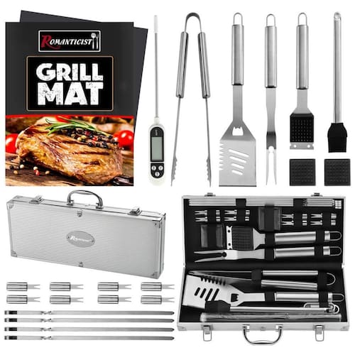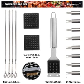 Conjunto Completo de Acessórios para Churrasqueiras Espátula, garfo, pinça, pincel para regar, termômetro de carne, escova para grelha, 2 cabeças de escova para grelha, 2 esteiras para grelha, 8 suportes para milho, 4 espetos, caixa de alumínio. Utensílios de churrasqueira superiores e duráveis Todos os acessórios para churrasco são feitos de aço inoxidável de nível profissional que resiste ao calor e resiste ao teste do tempo. Conjunto de churrasco portátil e conveniente para grelhar ao ar livre O kit de tamanho compacto é leve para transportar, perfeito para camping, piqueniques e moradores urbanos. Idéias de Natal perfeitas para todos em sua lista Este conjunto de ferramentas de grelha de luxo com estojo pode ser absolutamente feito para apresentação de presentes para familiares e amigos no Natal Marca: Não Informado