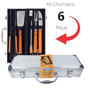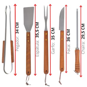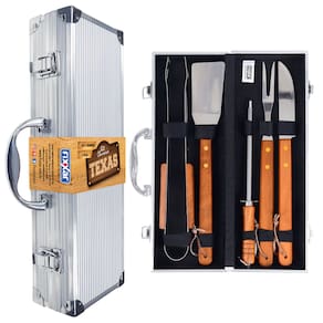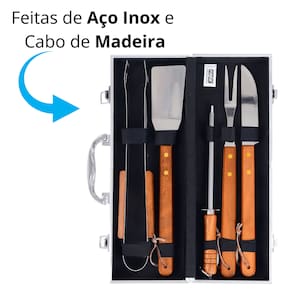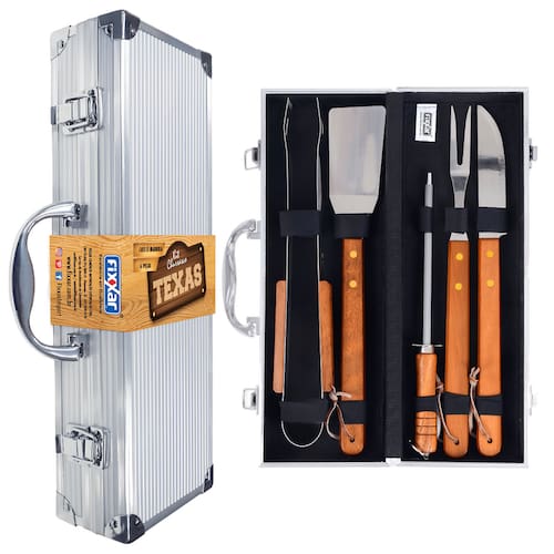 O Conjunto de Churrasco Texas Profissional, vem acompanhado de 5 acessórios para churrasco e de 1 maleta de alumínio, os acessórios possuem os cabos em Madeira e pontas em aço inox.