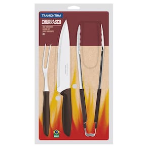 Kit Churrasco Tramontina Plenus 3 Peças Marrom Aço Inox O Kit para Churrasco Tramontina Plenus com Lâminas em Aço Inox e Cabos de Polipropileno Marrom 3 Peças é perfeito para você recepcionar sua família e amigos para aquela confraternização do fim de semana. Produzidas com lâminas em aço inox, as peças que compõem o kit oferecem alta resistência e durabilidade. Elas levam mais beleza à sua mesa e tem um manuseio leve e confortável, devido aos cabos de polipropileno na cor marrom. Além disso, são práticas e podem ser lavadas na máquina de lavar louças diariamente. Qualidade e eficiência você só encontra com os produtos Tramontina MATERIAL Lâminas de aço inox. A lâmina da faca tem maior durabilidade do fio devido ao tratamento térmico. A lâmina do garfo conta com maior espessura e uma estampagem do aço que garante maior resistência, evitando deformações. Pegador de aço inox com proteção emborrachada que proporcionam resistência durante o uso. Os cabos de polipropileno possuem maior resistência e durabilidade. Podem ir à máquina de lavar louças facilitando seu dia a dia. ITENS INCLUSOS 01 Faca Chef 8" Plenus 01 Garfo Trinchante Plenus 01 Pegador multiuso utilitá ORIENTAÇÕES Antes da primeira utilização, lave bem a peça e seque-a. Produto cortante e perfurante: tenha cuidado ao manusear e mantenha fora do alcance das crianças. Para maior durabilidade do produto recomenda-se secar bem antes de guardar, mesmo após lavagem em máquina. Para descarte do produto e embalagem siga as orientações de reciclagem vigentes. GARANTIA 90 dias para vícios ou defeitos de fabricação. Ean: 7891112275294