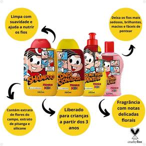 O Kit Cia da Natureza Mônica Kids para Cabelos Finos e Delicados é uma linha especialmente desenvolvida para os pequenos, com fórmula suave e ingredientes naturais. Possui extrato de flores do campo e pitanga. Ele contém um shampoo, um condicionador, um creme para pentear e uma colônia splash que proporcionam cuidado e hidratação para os fios finos e delicados, além de uma fragrância deliciosa. Mantém os cabelos macios e fáceis de desembaraçar. A fragrância leve e agradável, além de todo o carinho da personagem Mônica,tornam o momento do banho mais divertido e agradável para as crianças. Ideal para cabelos que exigem um cuidado extra, esse kit é dermatologicamente testado e livre de parabenos, garantindo segurança para a pele sensível dos pequenos.