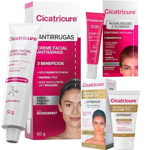 Kit cicatricure creme diurno contorno olhos protetor solar Bem vindo a a loja flocus. É um prazer tê-lo a como nosso a cliente Anúncio variável. Escolha os itens que melhor lhe atender, porém para uma skin care perfeita, recomendamos que utilize a linha completa cicatricure, especialista no cuidado com a pele. sua exclusiva fórmula com bio-regenext ajuda a recuperar a elasticidade e a firmeza da pele, reduzindo visivelmente as rugas e linhas de expressão. Conteúdo: 1 creme facial antissinais cicatricure - 50g 1 creme contorno de olhos rugas, bolsas e olheiras - 15g 1 protetor solar antissinais fps 50 toque seco cicatricure 40 g sem cor ou cor clara Cicatricure é especialista no cuidado com a pele. Uma marca parceira, com soluções eficazes e acessíveis pensadas especialmente para todos aqueles que querem cuidar da pele. Sua exclusiva fórmula com bio-regenext ajuda a recuperar a elasticidade e a firmeza da pele, reduzindo visivelmente as rugas e linhas de expressão. O creme facial cicatricure antissinais possui a tecnologia bio-regenext que transmite informações de uma célula para outra, promove a regeneração natural e repara os danos na pele proporcionando aparência mais jovem. Cicatricure contorno dos olhos reduz o volume das bolsas em 28% aos 15 dias e em 40% aos 30 dias E proporciona olheiras menos visíveis. Sua fórmula de textura leve diminui rugas e linhas de expressão e reduz o volume das bolsas. O novo cicatricure protetor solar antissinais fps 50 de uso diário com ácido hialurônico e pró-colágeno protege a pele do sol, ajudando a prevenir os sinais visíveis do foto-envelhecimento como rugas, linhas de expressão e manchas solares. Com partículas absorvedoras de oleosidade, confere toque seco e matifica a pele instantaneamente. fórmula resistente à água e ao suor. Testado dermatologicamente. Indicação: Todos os tipos de pele. protetor solar com cor somente para peles claras. Benefícios: reduz rugas possui a tecnologia bio-regenext, que recupera o envelhecimento da pele de 2 anos em 2 meses e reduz as rugas profundas; mais firmeza reafirma a pele, com resultados a partir da 1 aplicação; ingredientes a fórmula é rica em glicerina vegetal, óleos, manteigas e extratos vegetais que nutrem e hidratam a pele profundamente favorecendo a maciez e radiância da pele; proteção solar antissinais com ácido hialurônico e pró-colágeno, protege a pele do sol, ajudando a prevenir os sinais visíveis do foto envelhecimento como rugas, linhas de expressão e manchas solares. toque seco com partículas absorvedoras de oleosidade, confere toque seco e matifica a pele instantaneamente. Fórmula resistente à água e ao suor. Modo de uso: 1 passo: creme facial: Aplique pela manhã e à noite no rosto, pescoço e colo sobre a pele limpa e seca. Faça movimentos de baixo para cima até completa absorção. 2 passo: creme contorno de olhos: Utilizar pela manhã e à noite em todo o contorno dos olhos, incluindo a área das pálpebras. Massagear com movimentos suaves desde o interior até o exterior do contorno dos olhos. 3 passo: protetor solar antissinais: Aplique pela manhã e à noite no rosto, pescoço e colo sobre a pele limpa e seca. Faça movimentos de baixo para cima até completa absorção. Aplique abundantemente cicatricure protetor solar fps 50, no mínimo 30 minutos antes da exposição ao sol. Se a quantidade aplicada não for adequada, o nível de proteção será significativamente reduzido. Reaplicar sempre, generosa e frequentemente, quantas vezes for necessário para manter a proteção, especialmente após sudorese intensa, nadar ou banhar-se, secar-se com toalha e durante a exposição ao sol. Agradecemos por escolher a loja flocus e por confiar em nós para cuidar da beleza dos seus cabelos. Em caso de dúvidas, favor enviar sua pergunta Flocus
