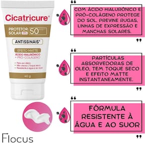 O novo cicatricure protetor solar antissinais fps 50 de uso diário com ácido hialurônico e pró-colágeno protege a pele do sol, ajudando a prevenir os sinais visíveis do foto-envelhecimento como rugas, linhas de expressão e manchas solares. Com partículas absorvedoras de oleosidade, confere toque seco e matifica a pele instantaneamente.