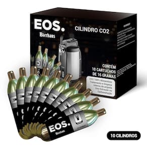 O cilindro de CO2 alimentício EOS é ideal para extração ou carbonatação de alimentos e bebidas. Produto sem rosca, compatível com chopeira EOS Bierhaus ECE05. Kit com 10 unidades.