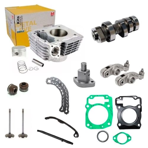 1 - Cilindro ( Metal Leve ) 1 - Pistão ( Metal Leve ) 1 - Jogo de anéis de segmento ( Metal Leve ) 1 - Pino do pistão (METAL LEVE) 2 - Travas do pino do pistão ( Metal Leve ) 1 - Junta Superior Kit A 2 - Retentor de Válvulas 1 - Válvula de Admissão 1 - Valvula de Escape 1 - Acionador Corrente do Comando ( WGK ) 1 - Corrente do Comando ( WW3 ) 1 - Árvore do Comando ( WgK ) 1 - Guia da Corrente do Comando 1 - Tensor da Corrente do Comando 2 - Balancim ( WGK )
