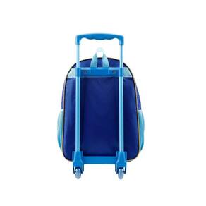 A mochila é produzida em poliéster resistente e estampado, com um painel frontal em PVC patch com espuma. Ela possui um compartimento principal amplo, bolsos laterais telados e um carrinho em metal com travas para facilitar o transporte. Os puxadores personalizados garantem um toque especial. Tamanho aproximado: 30cm de largura x 40cm de altura x 15cm de profundidade. Peso aproximado: 800g.