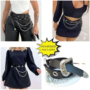 Cinto: Produto estiloso e moderno que vai dar aquela valorizada no visual. Possui fivela prateada com ponteira e passante prata, dando acabamento no final do cinto. Possui 6 furos, ilhós na lateral e 2 correntes saindo de 2 argolas. Cinto na cor preta com os acabamentos e acessórios na cor prata. Simplesmente lindo!