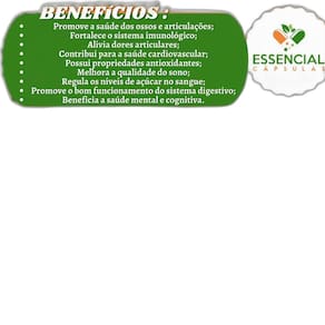 - Alívio de dores articulares e musculares - Redução da inflamação - Fortalecimento do sistema imunológico - Melhora da saúde óssea e dentária - Auxílio no controle da pressão arterial - Melhora da saúde cardiovascular - Estímulo da função renal - Ação antioxidante - Combate a infecções e inflamações - Promove a saúde digestiva - Contribui para o equilíbrio mineral do corpo - Auxílio no combate a doenças reumáticas e artrite - Alívio de sintomas de problemas respiratórios