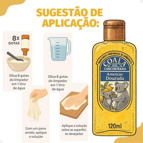 Dilua 8 gotas do Limpador Perfumado de Ambientes Coala Ameixa Dourada em 1 litro de água. Com um pano limpo e úmido, aplique a solução sobre as superfícies desejadas. Este método é eficaz para limpeza de pisos, móveis e outras superfícies não porosas.