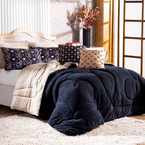 Kit Coberdrom Golden Love Preto Queen C/ Almofadas 05 Peças - Dupla Face Manta E Sherpa Colorida A nova coleção de coberdrons Golden Love traz toda a sofisticação e aconchego. Por possuírem dupla face, apresentam superfície que valoriza ainda mais as cores e também as cores da sherpa colorida, que é a novidade e a tendência do inverno desse ano! Confeccionado em pantográfica computadorizada com lindos desenhos de Corações, perfeito para presentear quem você ama! Composto de Manta Microfibra em poliéster com 150gr de enchimento, sofisticado e extremamente macio, perfeito para aquecer, acompanhando também porta-travesseiros estampados e capinhas de almofadas estampadas temáticas, todas com viés e zíper para facilitar seu dia-a-dia. Ideal para decorar, trazer conforto e tornar o quarto ainda mais convidativo e elegante! Confira! Contém:01 Coberdrom Queen 2,40m x 2,20m02 Porta Travesseiros Estampados 70cm x 50cm 02 Capas de Almofadas Estampadas 45cm x 45cm OBS: Demais itens da foto são vendidos separadamente. Composição:Manta Microfibra Preta: 100% PoliésterSherpa Colorido Cáqui: 100% PoliésterEnchimento: 100% Poliéster Porta Travesseiros e Capas de Almofadas Estampados: Microfibra 100% Poliéster Instruções de Uso e Lavagem:Vide etiqueta do produto. Atenção:Foto meramente ilustrativa.Variação das cores podem ocorrer de acordo com o monitor.