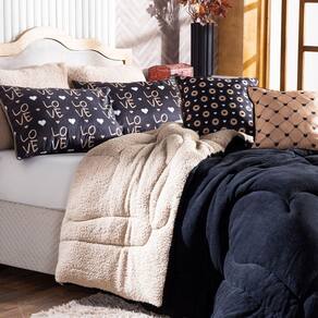 Kit Coberdrom Golden Love Preto Casal Padrão C/ Almofadas 05 Peças - Dupla Face Manta E Sherpa Colorida A nova coleção de coberdrons Golden Love traz toda a sofisticação e aconchego. Por possuírem dupla face, apresentam superfície que valoriza ainda mais as cores e também as cores da sherpa colorida, que é a novidade e a tendência do inverno desse ano! Confeccionado em pantográfica computadorizada com lindos desenhos de Corações, perfeito para presentear quem você ama! Composto de Manta Microfibra em poliéster com 150gr de enchimento, sofisticado e extremamente macio, perfeito para aquecer, acompanhando também porta-travesseiros estampados e capinhas de almofadas estampadas temáticas, todas com viés e zíper para facilitar seu dia-a-dia. Ideal para decorar, trazer conforto e tornar o quarto ainda mais convidativo e elegante! Confira! Contém:01 Coberdrom Casal Padrão 2,35m x 2,15m02 Porta Travesseiros Estampados 70cm x 50cm 02 Capas de Almofadas Estampadas 45cm x 45cm OBS: Demais itens da foto são vendidos separadamente. Composição:Manta Microfibra Preta: 100% PoliésterSherpa Colorido Cáqui: 100% PoliésterEnchimento: 100% Poliéster Porta Travesseiros e Capas de Almofadas Estampados: Microfibra 100% Poliéster Instruções de Uso e Lavagem:Vide etiqueta do produto. Atenção:Foto meramente ilustrativa.Variação das cores podem ocorrer de acordo com o monitor.