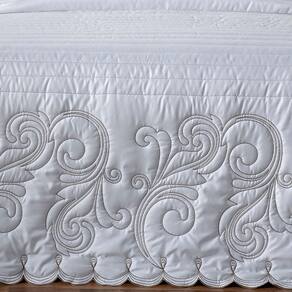 Kit enxoval duo queen 06 peças 01 cobre leito matelassado e bordado 2,70m comp. X 2,60m larg. 02 porta travesseiros matelassados com debrum. Medida útil: 70cm x 50cm 02 fronhas bordadas com abas em 3 lados. Medida útil: 70cm x 50cm 01 lençol de baixo com elástico em toda volta 2,00m comp. X 1,60m larg. X 40cm alt. Composição Tecido: percal 180 fios 100% poliéster Manta: 100% poliéster Com o kit versátile duo você pode decorar sua cama de duas maneiras: